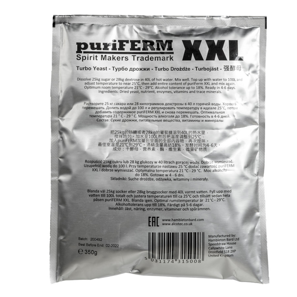 PuriFerm XXL active dry alcohol turbo-yeast (350 gr) with a full range of macro and micro nutrient elements, ideal for fermenting fruit and sugar bases of any raw material (glucose sugar syrup). PuriFerm XXL turbo yeast (350 gr) is especially suitable for fast and high alcohol fermentation - the strength of the finished mash is up to 18%.