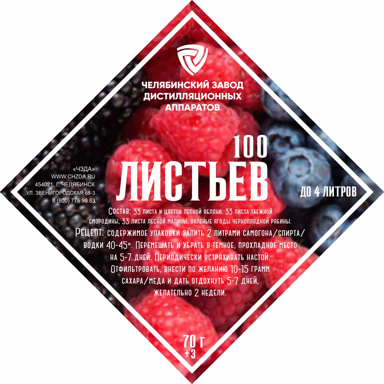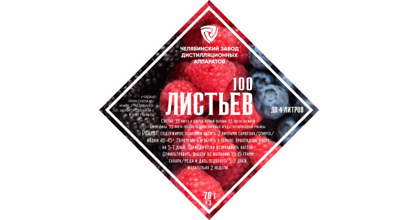 Nabor trav i specij "100 List'ev "Sostav:33 lista i cvetov lesnoj yabloni, 33 lista taezhnoj smorodiny, 33 lista lesnoj maliny, vyalenye yagody chernoplodnoj ryabiny.Recept prigotovleniya:soderzhimoe upakovki zalit' 2 litrami samogona/ spirta/ vodki ..