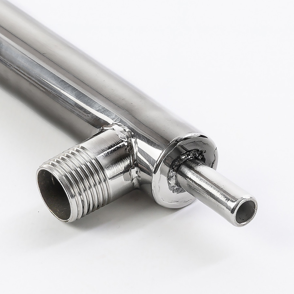 The Gorilych shell-and-tube aftercooler with an 8 mm fitting is made of food grade stainless steel, which guarantees safety of use and durability. The design is a hollow stainless pipe (casing) with a diameter of 25 mm, through which a stainless tube of a smaller diameter passes, ending at both ends with welded flanges with a diameter of 8 mm. Two unions with M20 thread are welded on the casing of the aftercooler for installing quick-detachable connectors on them (connectors are not included in the kit and are purchased separately) for supplying and discharging cooling water through hoses.