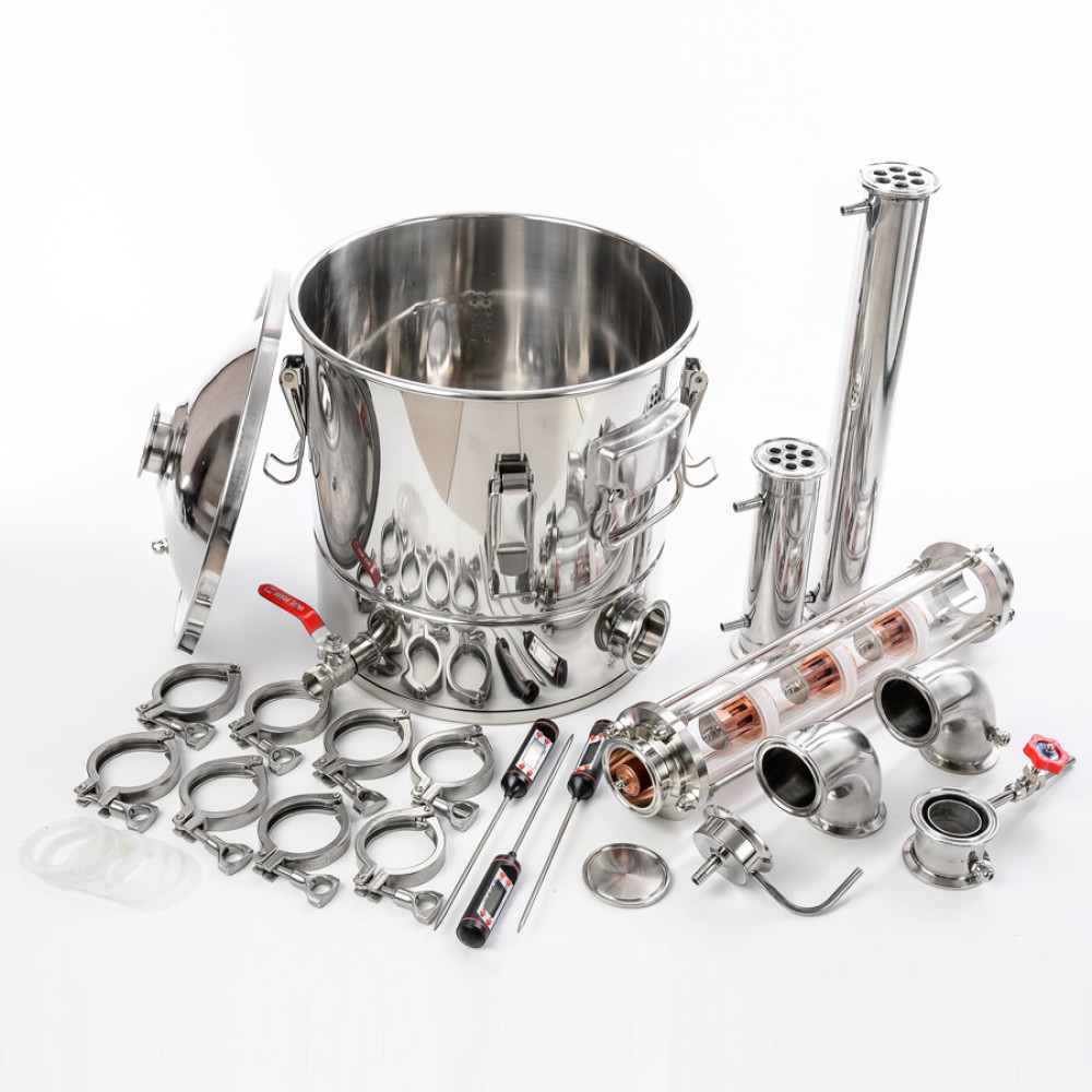 The set of equipment is equipped with everything necessary for operation - there is a reflux condenser, a refrigerator and a head selection unit, the productivity of the equipment reaches 2 liters per hour. All elements of the equipment are interconnected by means of quick-detachable clamps, today this is the best technical solution for moonshine equipment.