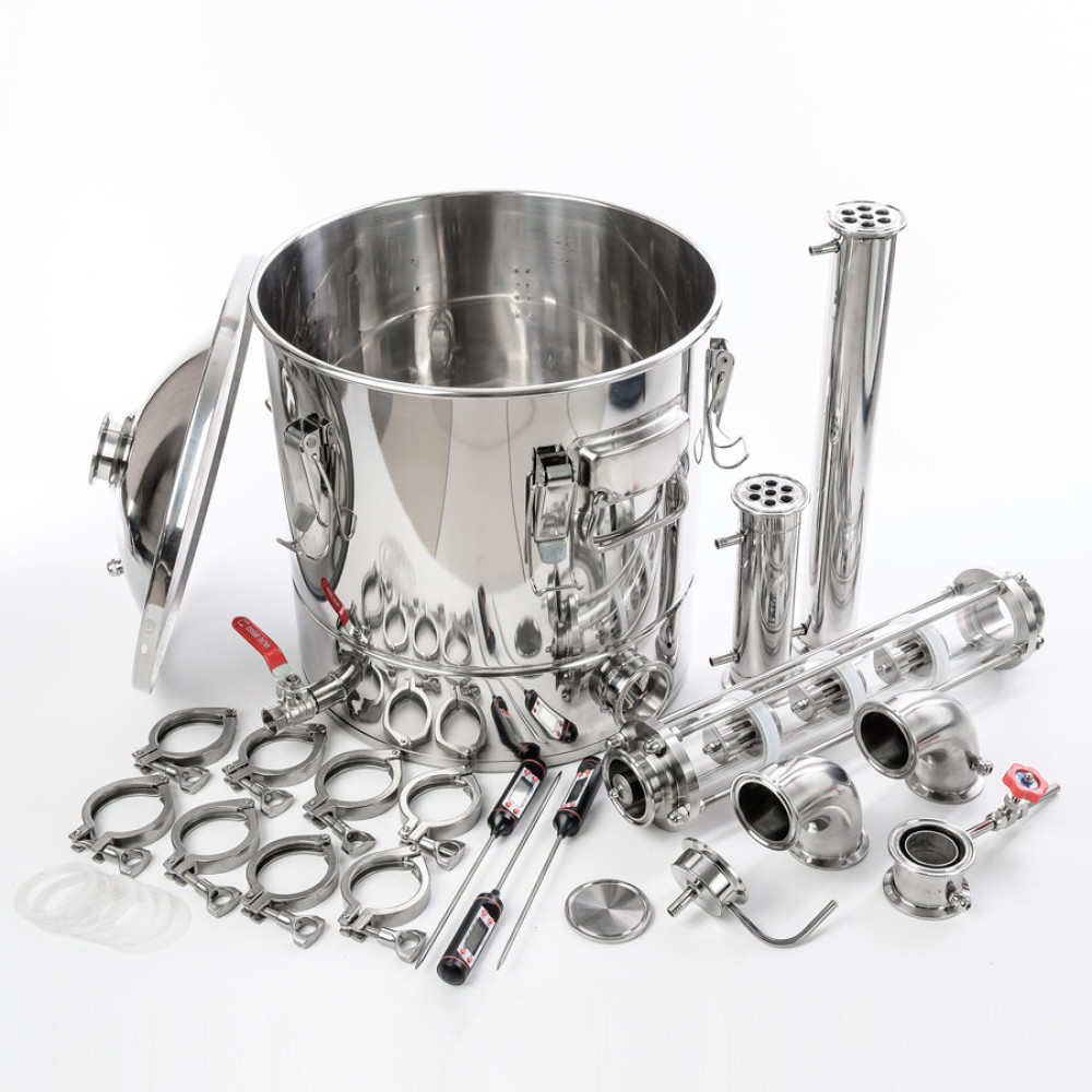 Thanks to its wide mouth (350 mm), the distillation cube is suitable for thick bregs based on jam or malt - it is easy to clean, and the internal grooves allow you to quickly and conveniently set a false bottom with a diameter of 350 mm to avoid sticking of thick bregs. The standard package includes a reflux condenser, a refrigerator and a head selection unit. Also, the standard package includes an already installed 2-inch KLAMP-type flange for installing the heating element into the distillation cube. The productivity of the equipment reaches 1 liter of finished product per hour. All components are made on high-precision equipment, are of factory quality, the manufacturer's warranty is 1 year.